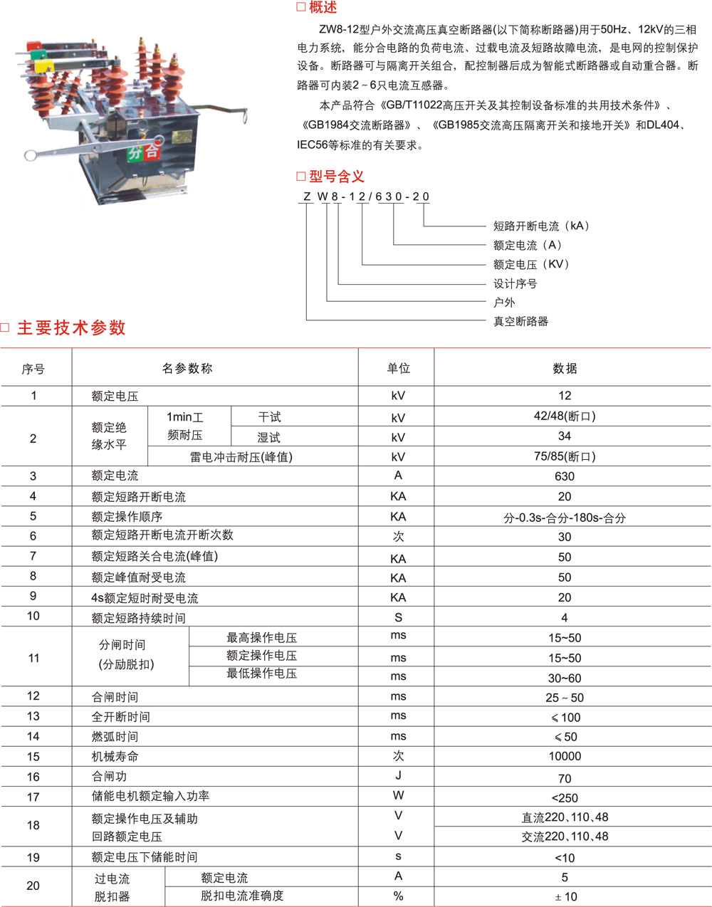 ZW8-12/630-20户内高压真空断路器