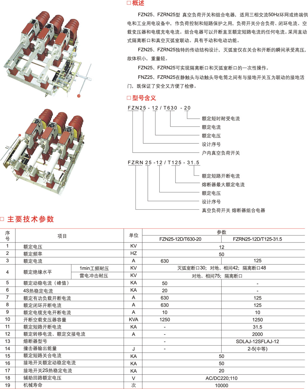 FZN25户内高压负荷开关、FZRN25户内高压负荷开关及熔断器组合电器